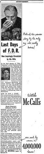 In her final chapter of “This I Remember,” in the December issue of McCALL’S, Mrs. Roosevelt reveals with absorbing clarity, candor and love the little-known and widely disputed facts about her husband’s final illness and death. Everyone must surely read these historic words with reverence, admiration and intense interest.