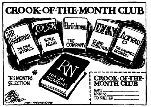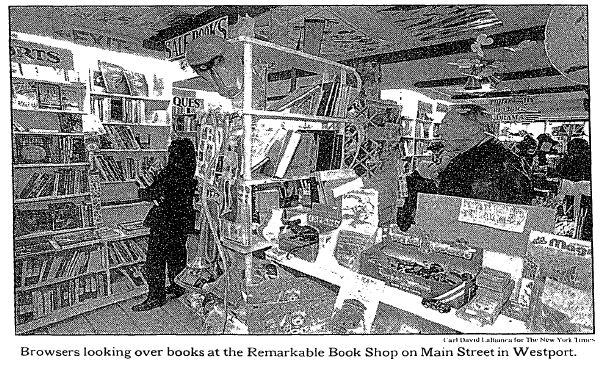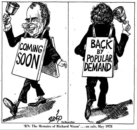 For further proof of this, check out this contemporary news broadcast (YouTube) and, below, some great caricatures of Nixon as author. I also wrote a blog post for the Times about the two “deluxe” editions of Nixon’s memoirs — this phenomenon of presidential publishing also occurred with Carter’s, Reagan’s, Clinton’s, and, now, Bush’s books — and there are some images of those editions. After that, as promised, a few old newspaper photos of the Remarkable Book Shop. Sid told me that, when the RBS closed in 1993, Paul Newman called him and said, “Don’t close — you can’t close.”