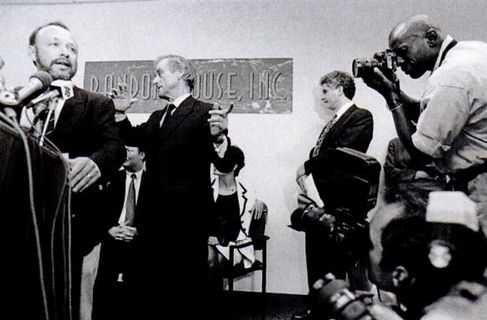 In both instances, Klein tried to have it both ways. And this, along with some sanctimony — the picture above comes from his confessional press conference, where he invoked Henry Adams several times — seems to have been his main error. Even here, though, Klein was easily outdone by the rest of the media, and more on them in a second. But first, a few more examples of Primary Colors‘ popularity. Klein got $1.5 million for the book’s paperback rights, another million plus for international rights (19 countries!), and another million for film rights. A very conservative estimate of his total take would run to $6 or $7 million. It’s no surprise that, almost immediately, phrases like “the Russian version of Primary Colors” started cropping up (here, in the NYT), or that politicians started saying things like “Now the biggest parlor game in Washington, besides trying to figure out who wrote Primary Colors, is trying to decide whether or not President Clinton wants a real balanced-budget agreement” (here, Bob Dole).